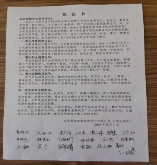 為深入貫徹落實習近平總書記的重要指示精神,示范帶動公司形成“厲行節(jié)約、反對浪費”的良好風尚。海勃灣城市供水公司水質(zhì)檢測中心發(fā)起了“厲行節(jié)儉,杜絕浪費”倡議書。倡議書主要內(nèi)容是從現(xiàn)在開始,從生活習慣做起,在細微之中爭做勤儉節(jié)約的傳播者、踐行者和示范者,用實際行動展現(xiàn)出理性消費,節(jié)約勤儉的良好社會風尚,共同為建設(shè)文明、和諧、環(huán)保的社會環(huán)境作出應(yīng)有的貢獻!