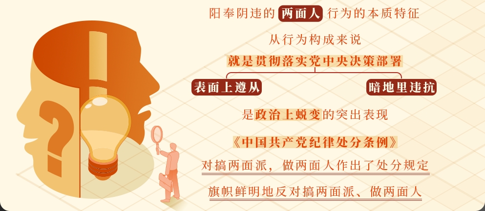 《中國共產(chǎn)黨紀(jì)律處分條例》規(guī)定,對黨不忠誠不老實,表里不一,陽奉陰違,欺上瞞下,搞兩面派,做兩面人,在政治上造成不良影響的,給予警告或者嚴(yán)重警告處分;情節(jié)較重的,給予撤銷黨內(nèi)職務(wù)或者留黨察看處分;情節(jié)嚴(yán)重的,給予開除黨籍處分。我們黨始終旗幟鮮明地反對搞兩面派、做兩面人。黨章第三條將“對黨忠誠老實,言行一致”,“反對陽奉陰違的兩面派行為和一切陰謀詭計”作為黨員必須履行的義務(wù),將“對黨忠誠”寫入入黨誓詞?!蛾P(guān)于新形勢下黨內(nèi)政治生活的若干準(zhǔn)則》規(guī)定,“黨的各級組織和全體黨員必須對黨忠誠老實、光明磊落,說老實話、辦老實事、做老實人”,“反對搞兩面派、做‘兩面人’”。大量案件表明,黨內(nèi)一些人在這方面問題突出,說一套、做一套,臺上一套、臺下一套,當(dāng)面一套、背后一套,隱藏很深,危害很大。陽奉陰違的兩面人行為的本質(zhì)特征,從行為構(gòu)成來說,就是貫徹落實黨中央決策部署表面上遵從,暗地里違抗,是政治上蛻變的突出表現(xiàn)。此次《條例》修訂,將2018年《條例》相關(guān)條款中的“情節(jié)較輕”修改為“在政治上造成不良影響”,更進(jìn)一步明確了陽奉陰違的兩面人行為必須具有政治危害。衡量是否屬于搞兩面派、做兩面人,根本標(biāo)準(zhǔn)就是政治標(biāo)準(zhǔn),就是對黨是否忠誠老實,看表里行為是否體現(xiàn)突出的兩面性和政治危害性。搞兩面派,做兩面人的行為,違背黨員義務(wù),損害黨的團結(jié)和統(tǒng)一,損害黨和人民利益,渙散黨的組織,透支黨的信譽,損害黨的形象,危害很大。黨員、干部必須嚴(yán)格遵守黨章、準(zhǔn)則要求,對照《條例》規(guī)定,切實做到對黨組織忠誠老實、襟懷坦白、言行一致。