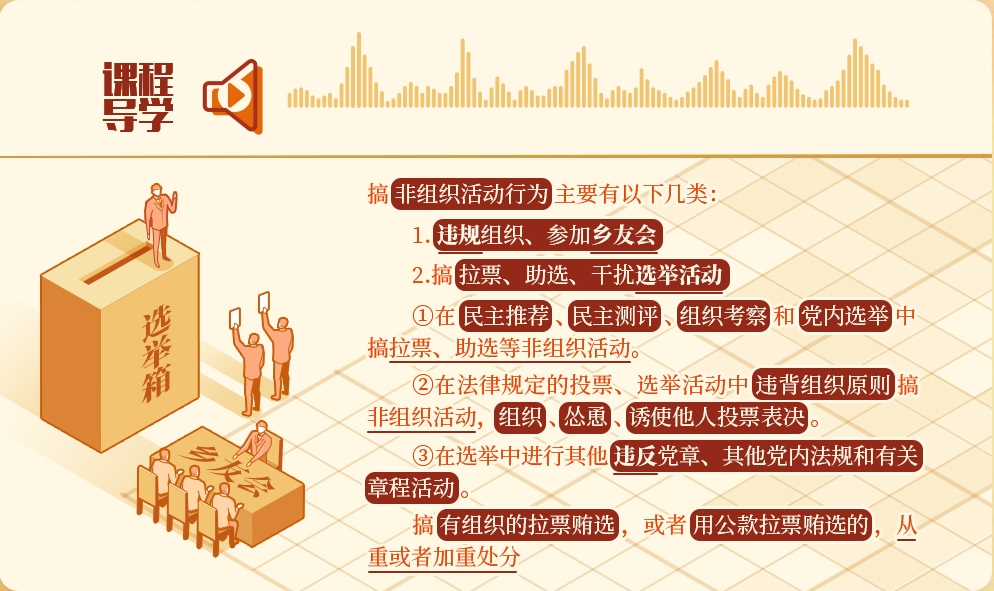 黨內(nèi)選舉是黨內(nèi)政治生活的重要組成部分?!蛾P(guān)于新形勢(shì)下黨內(nèi)政治生活的若干準(zhǔn)則》規(guī)定,黨內(nèi)選舉必須體現(xiàn)選舉人意志,堅(jiān)決防止和查處拉票賄選等行為。在選舉活動(dòng)中搞非組織活動(dòng),干擾選舉人表達(dá)選舉意愿,侵犯其他被選舉人權(quán)益,侵蝕黨內(nèi)政治文化,在黨員群眾中造成不良影響,對(duì)這類違反組織紀(jì)律的行為必須予以堅(jiān)決懲治。
