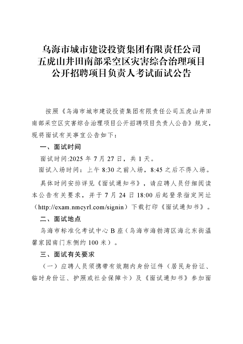 烏海市城市建設(shè)投資集團(tuán)有限責(zé)任公司五虎山井田南部采空區(qū)災(zāi)害綜合治理項(xiàng)目公開招聘項(xiàng)目負(fù)責(zé)人考試面試公告