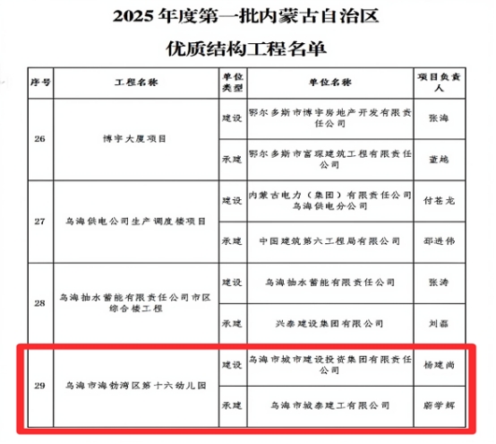 烏海市海勃灣區(qū)第十六幼兒園項目榮獲2025年度第一批內(nèi)蒙古自治區(qū)優(yōu)質(zhì)結(jié)構(gòu)工程