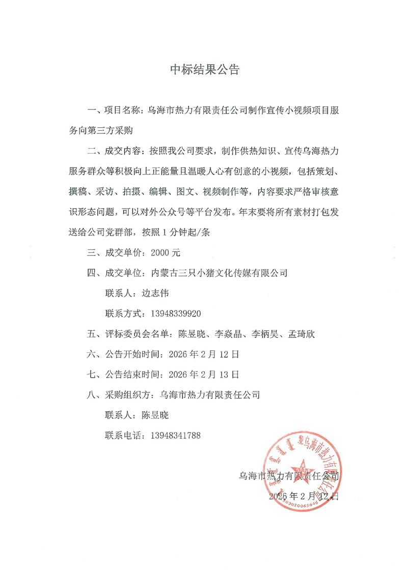- 2026-02-25烏海市熱力有限責(zé)任公司車輛維修保養(yǎng)服務(wù)采購成交結(jié)果公告