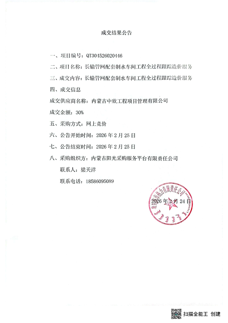 - 2026-02-25長(zhǎng)輸管網(wǎng)配套制水車間新建工程監(jiān)理服務(wù)采購(gòu)項(xiàng)目成交結(jié)果公告